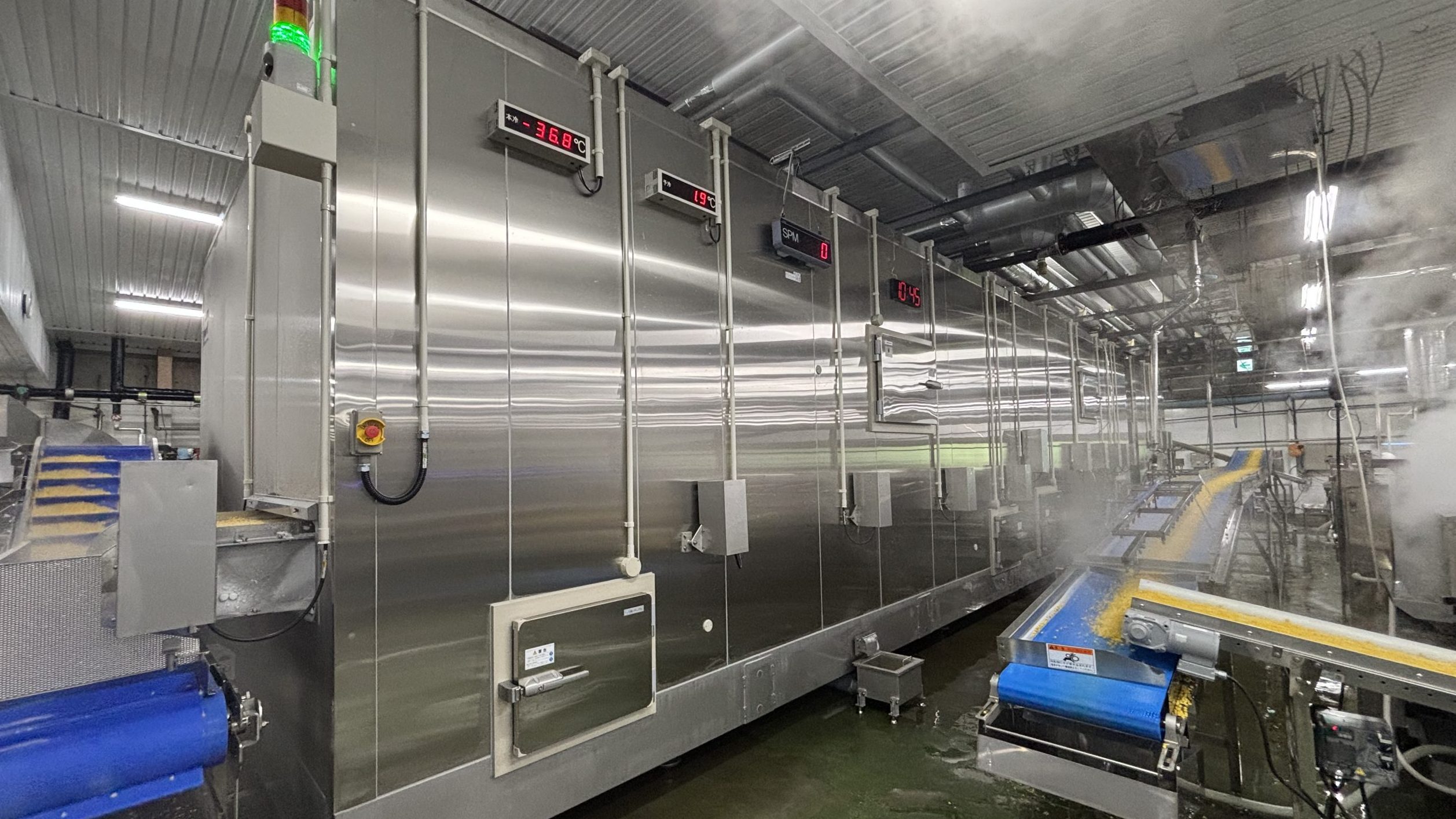 フリーザー導入により急速冷却による品質ならびに生産性の向上。内部3段コンベアの構造により、省スペースを実現。CIP装置により、洗浄作業の省人化も実現。